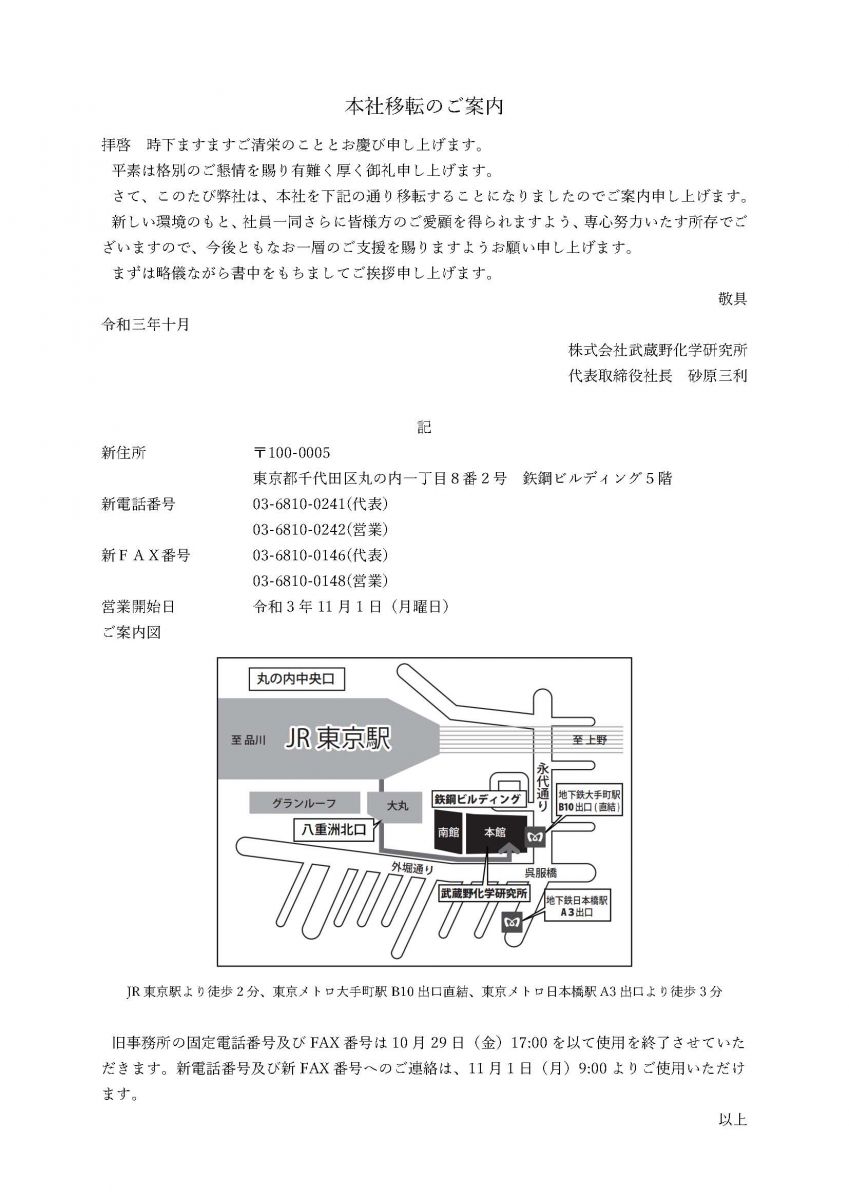 母公司“株式会社武藏野化学研究所”搬迁新址